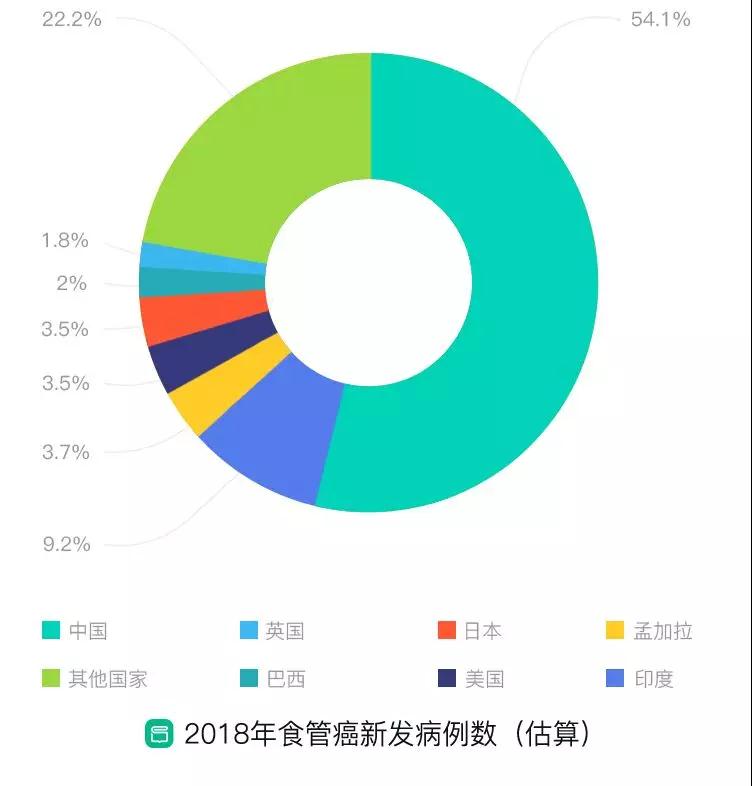 數(shù)據(jù)顯示,2018年有57.2萬人新診斷為食管癌,同時(shí)又有50.9萬人死于食管癌。根據(jù)WHO數(shù)據(jù),我國食管癌患病率和死亡率排在全球第五位;但因我國龐大的人口基數(shù),食管癌新發(fā)患者和死亡患者的人數(shù)卻占全球的55%左右。