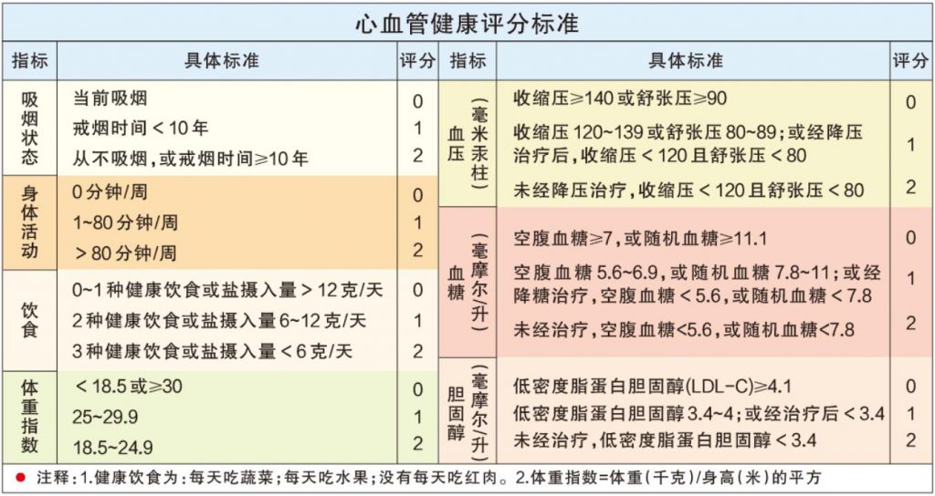 在《中華醫(yī)學(xué)雜志(英文版)》上,華中科技大學(xué)同濟醫(yī)學(xué)院等機構(gòu)的研究人員曾針對理想心血管健康與中國成年人死亡風(fēng)險降低的關(guān)聯(lián)進行研究,根據(jù)近20萬人的健康數(shù)據(jù)分析得出,不論個人當(dāng)前的醫(yī)學(xué)因素和生活行為是怎樣的,只要盡早以健康的生活行為和良好的心臟代謝狀況為目標(biāo)采取措施,就可以減少過早死亡。他們還提出了適合評估國人心血管健康的評分標(biāo)準(zhǔn)(如圖),總分為0~6分,代表心血管健康水平不良,7~9分為中等水平,10~14分為理想水平。