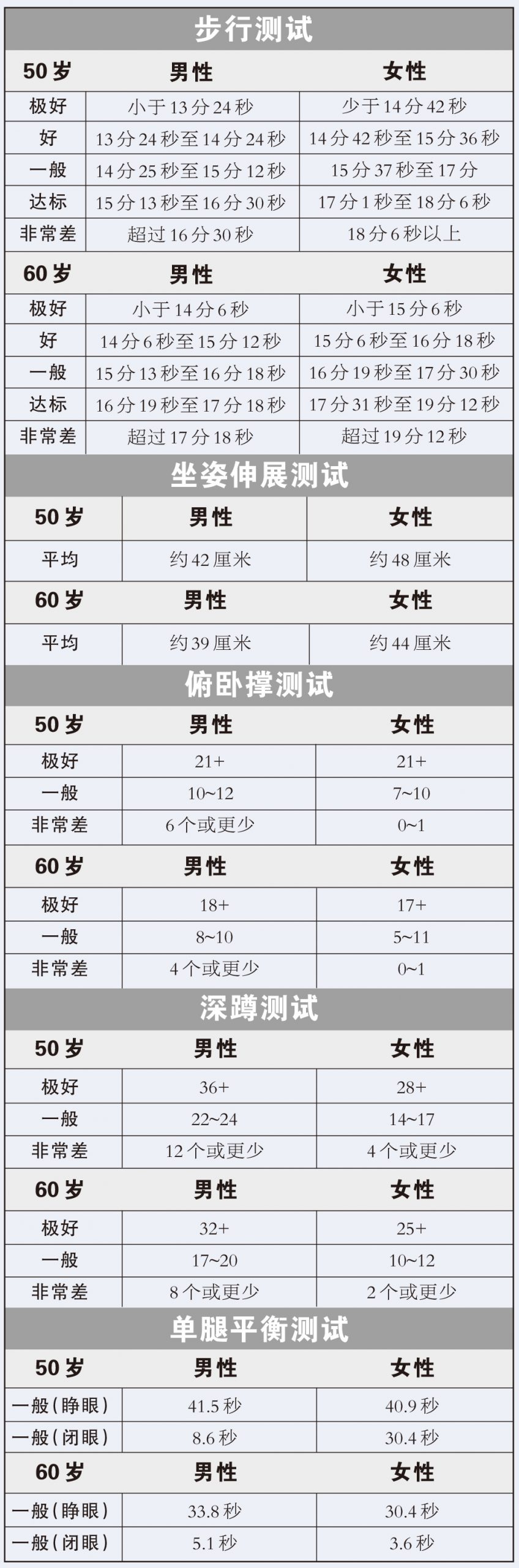 你是怎么發(fā)現(xiàn)自己變老了?是新添的白發(fā)還是皺紋?其實,衰老從來不是瞬間降臨的,美國梅奧診所健康生活項目醫(yī)學顧問唐納德·韓斯盧德博士表示,了解身體衰老現(xiàn)狀,有助于制訂更有的放矢的個性化健身方案。美國退休人員協(xié)會官網(wǎng)最新刊文,推薦“可判斷衰老現(xiàn)狀的5項自我測試”,具體標準如右表,大家可以將其作為參考,進行一個簡單評估。本期,北京老年醫(yī)院康復醫(yī)學科副主任醫(yī)師高亞南,為延緩衰老提供一些改進措施。
